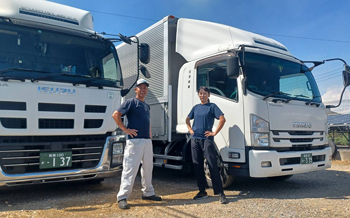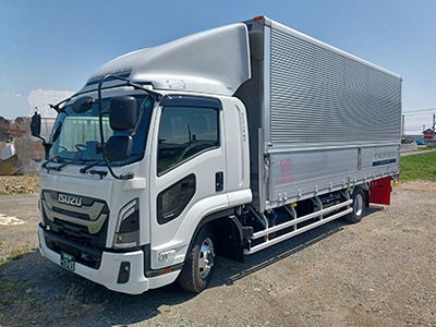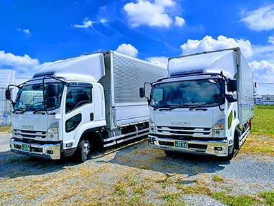 現在のトラック保有台数は、4トンウイング車8台、大型ウイング車1台です。定期便と一般フリー便で、衣料品、雑貨品、工業製品、工業用原料、食品などの配送業務を行っています。運送事業者としてのプロフェッショナル意識を大切にして、様々なニーズに応えられるよう、多種多様のトラックの増車を随時検討しています。